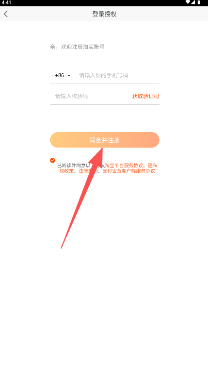 1、输入手机号与验证码并勾选协议后点击"同意"并注册按钮。