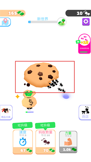 4、积极参与免费奖励活动,获取大量金币,用于升级蚂蚁数量、速度和力量等属性。