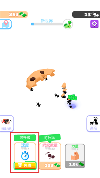 2、升级“速度”属性,提升蚂蚁的移动和资源收集效率,可选择免费升级途径,降低资源消耗。