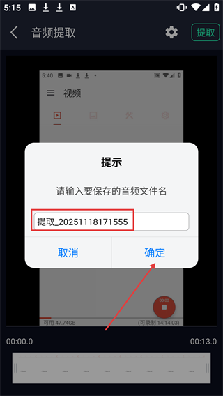4、在“请输入要保存的音频文件名”提示框中,确认文件名后点击【确定】,完成音频提取保存操作。