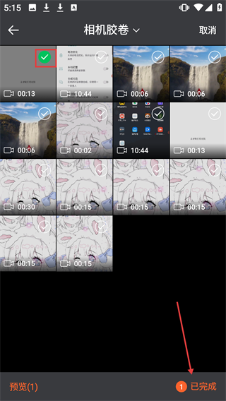 2、在相机胶卷界面,选择目标视频后点击右下角【已完成】。