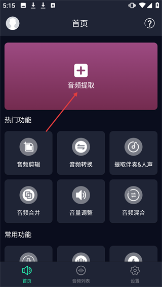 1、在音频提取应用首页,点击【音频提取】功能按钮。