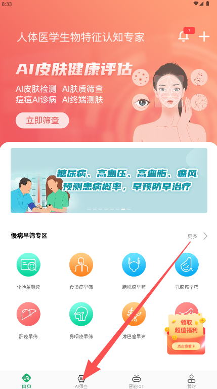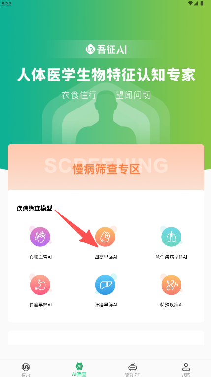 1、在首页底部导航栏点击“AI筛查”进入疾病筛查专区。