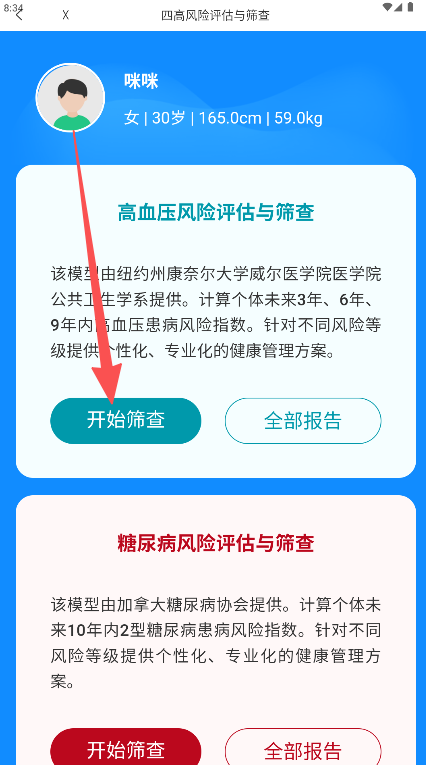 3、查看模型说明后点击“开始筛查”按钮进行健康风险评估。