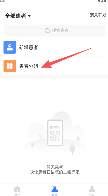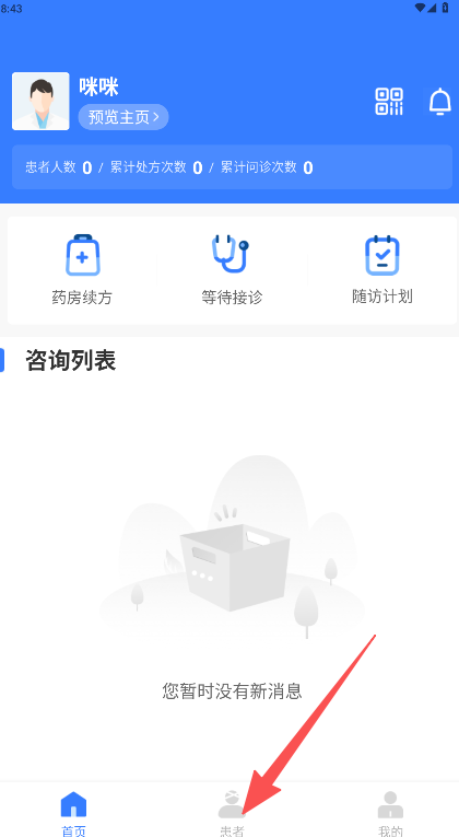 1、在首页底部导航栏点击“患者”按钮进入患者管理页面。