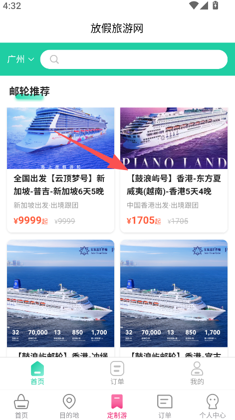2、查看邮轮推荐(如鼓浪屿号),进入产品详情页。