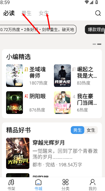 2、在书城页面的分类栏中,找到明确划分的 “男生”“女生” 专属频道,点击对应频道即可筛选出适配题材书籍,男生频道涵盖玄幻修仙、都市爽文等,女生频道包含言情穿越、古言宫斗等。