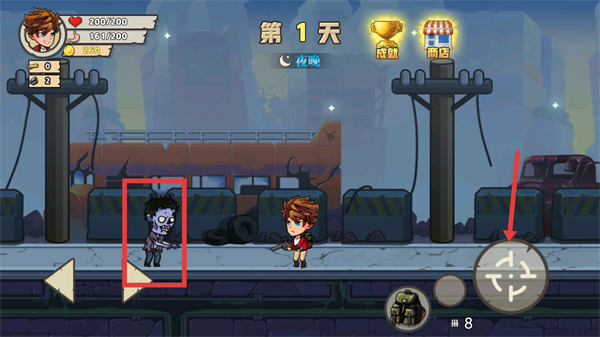 2、瞄准红色框内的僵尸,点击右侧的瞄准按钮发起攻击,消灭僵尸保障生存。