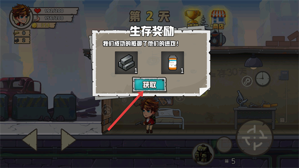 3、成功抵御僵尸进攻后,点击【获取】按钮,领取生存奖励,获得资源道具。