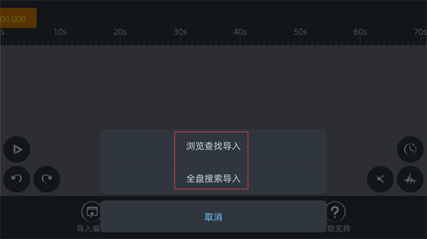 4、选择【浏览查找导入】或【全盘搜索导入】方式,导入需要编辑的音频文件。