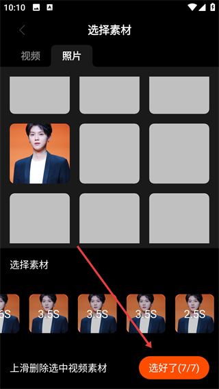 3、进入选择素材页面,选择照片素材后点击【选好了(7/7)】按钮。