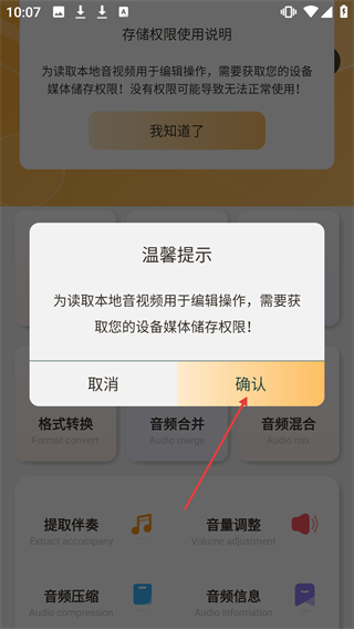 2、在弹出的存储权限温馨提示中,点击【确认】按钮,获取设备媒体存储权限以继续操作。