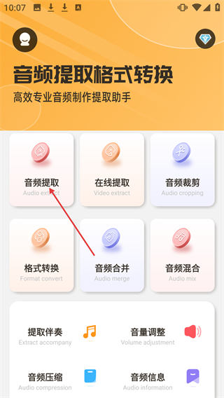 1、在应用主界面,点击【音频提取】功能模块,进入音频提取流程。