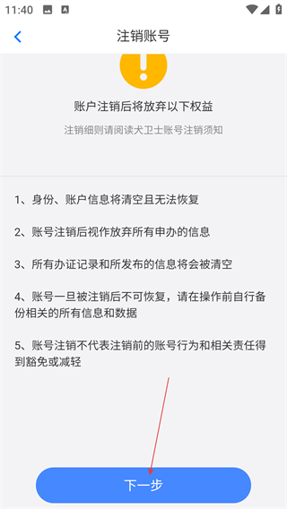 4、阅读注销权益放弃说明后,点击【下一步】,继续完成账号注销的后续操作。