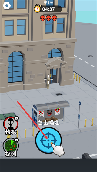 4、继续瞄准其他藏在区域的外星人,点击【射击】按钮,完成关卡目标。