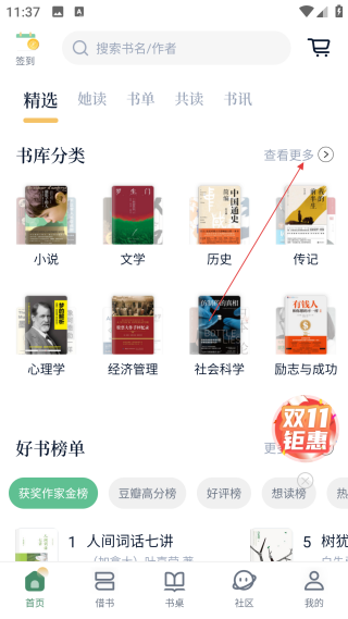 1、在书库首页,点击【查看更多】,进入书库分类的完整列表页面。