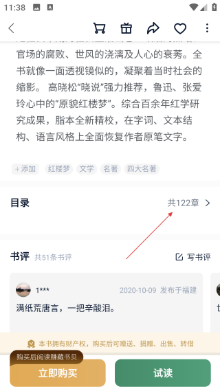 3、在书籍详情页,点击【目录】,查看该书籍的章节列表内容。