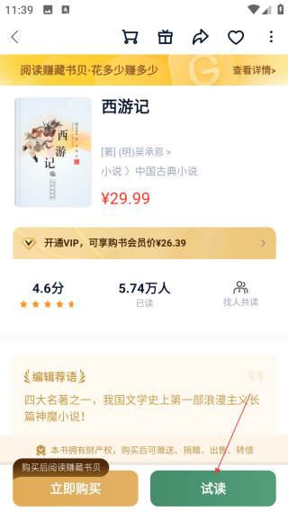 4、在书籍详情页,点击【试读】,即可开始阅读该书籍。