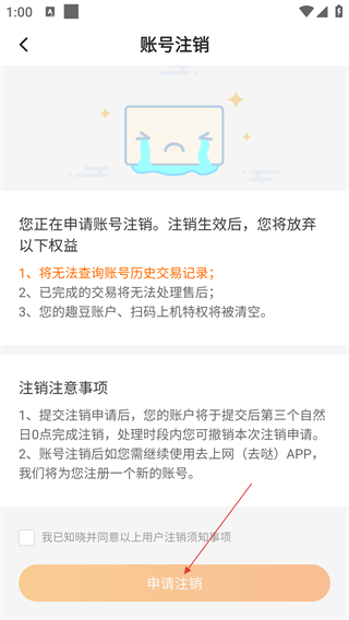 4、阅读注销权益与注意事项后,勾选同意后点击“申请注销”,提交账号注销申请。