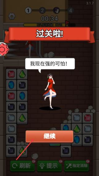 4、关卡通关后,点击【继续】按钮,进入后续的游戏关卡进程。