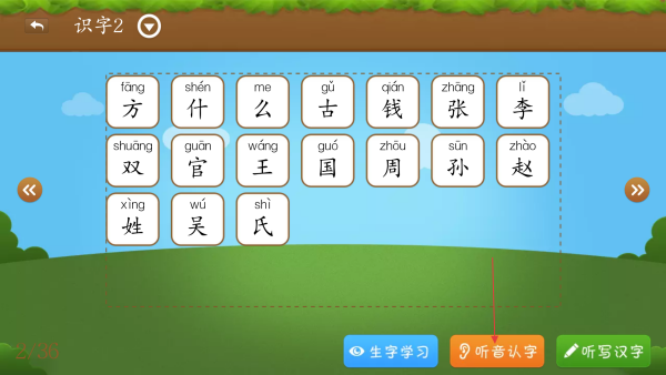 2、在识字页,点击【听音认字】,进入汉字听音辨识的练习界面。