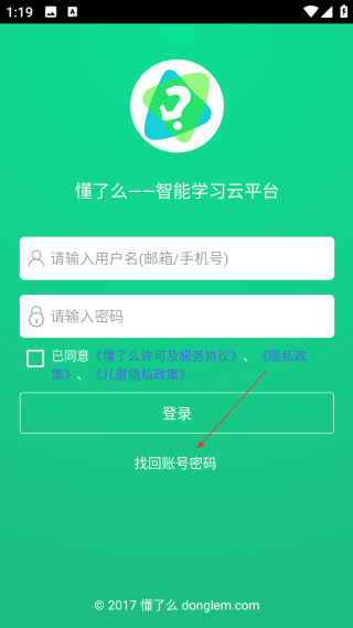 1、在懂了么登录页,点击【找回账号密码】,进入账号密码找回页面。