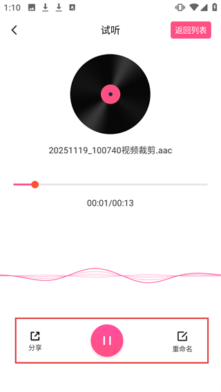 4、可试听提取的音频,还能进行【分享】或【重命名】操作。