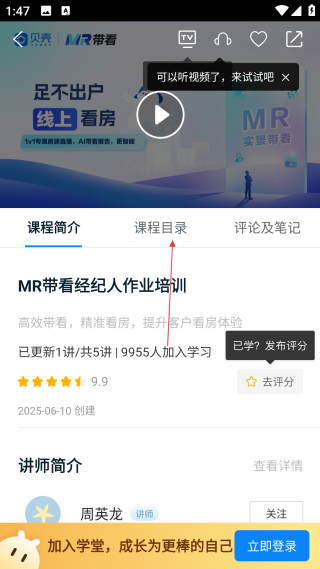 3、在课程详情页,点击【课程目录】,查看该课程的章节内容。