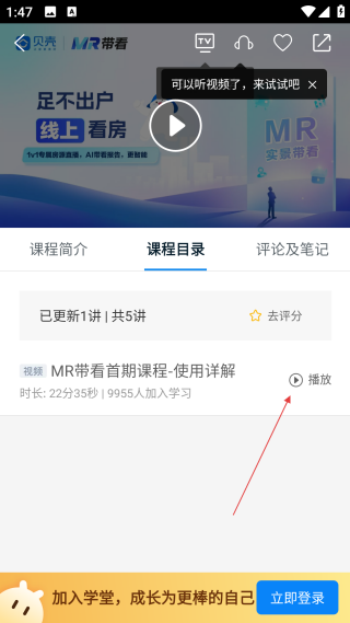 4、在课程目录页,点击【播放】,即可开始学习对应章节的课程内容。