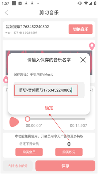 4、在弹出的命名窗口中,确认或修改保存的音乐名字后,点击【确定】按钮,完成音乐剪切保存操作。