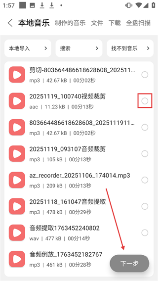 3、在本地音乐列表中选择目标音乐后,点击【下一步】按钮。