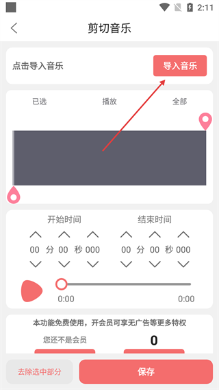 2、在剪切音乐界面,点击【导入音乐】按钮,选择需要剪切的音乐。