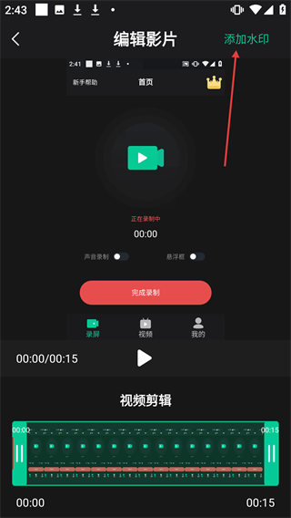 3、在编辑影片界面,点击【添加水印】,进行水印添加操作。
