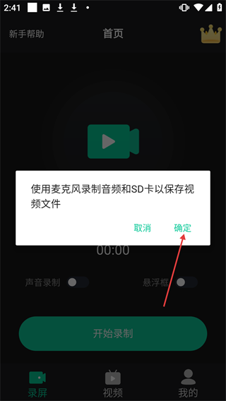 3、在弹出的权限提示框中,点击【确定】按钮,允许使用麦克风录制音频和SD卡保存视频文件。