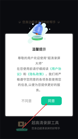 1、在超高清录屏工具的温馨提示界面,点击【同意】按钮,确认遵守《用户协议》和《隐私政策》。