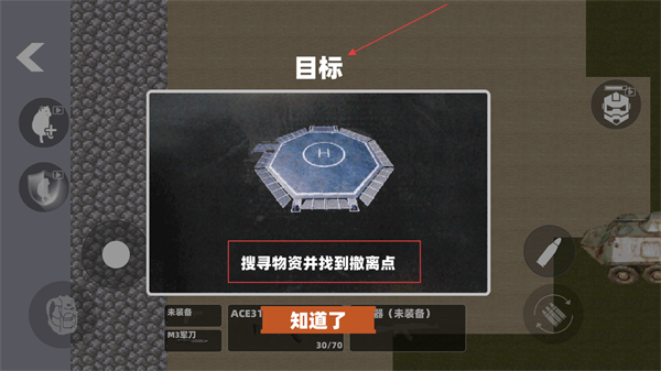2、开始挑战后先确认目标为搜寻物资并找到撤离点,点击【知道了】关闭提示进入战斗场景。