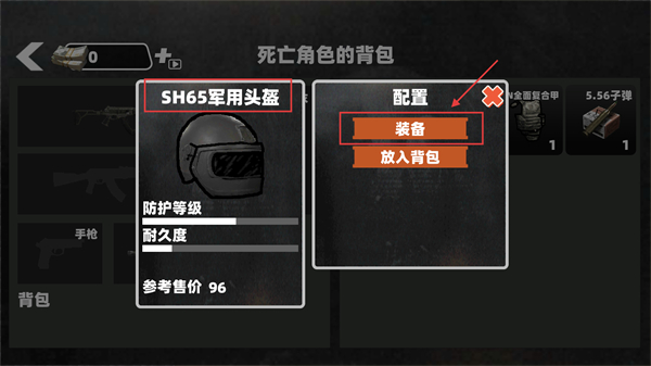 3、战斗中获取【SH65军用头盔】后点击【装备】按钮提升防护等级,增强自身生存能力。
