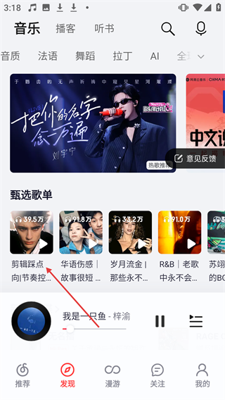 2、在发现页面的“甄选歌单”中,点击【剪辑踩点】歌单,进入歌单详情页。