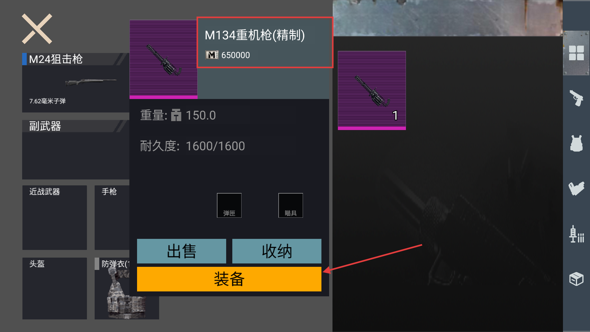 1、在武器界面选中【M134重机枪-精制】后点击【装备】按钮,即可将其配置为主武器参与战斗。