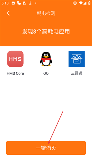 2、在耗电检测界面点击【一键消灭】,处理高耗电应用。