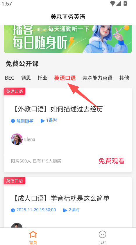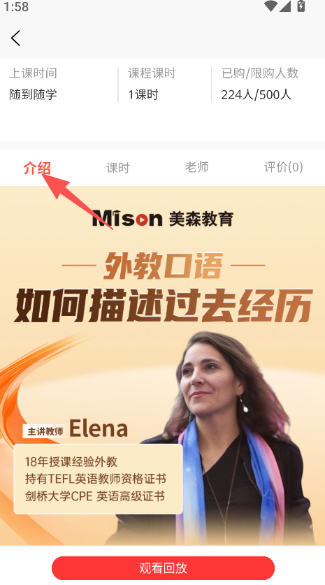 2、选择课程(如外教口语如何描述过去经历),查看课程介绍。
