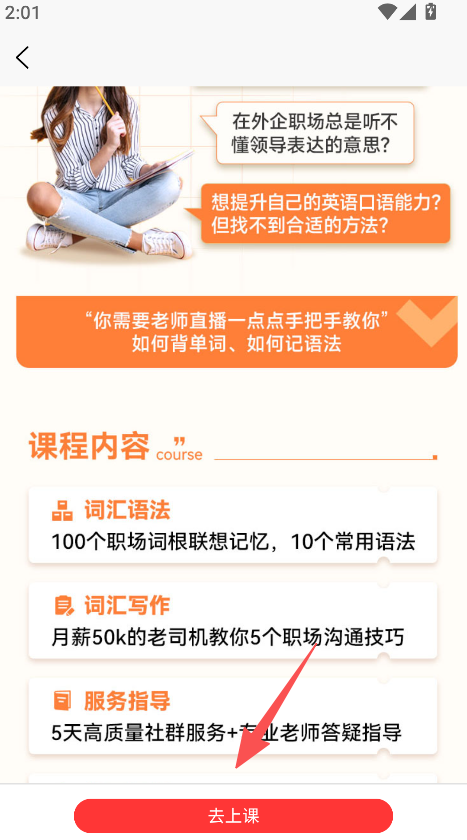 2、以职场应用为导向,提供英语口语、职场沟通类课程,助力学习者提升商务场景英语应用能力,满足职场需求。