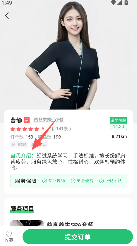 1、打开软件,选择理疗师,查看技师详情(如自我介绍、服务保障)。