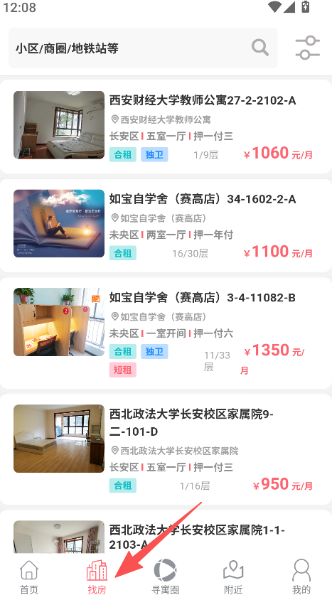 1、打开软件,进入找房板块,浏览多样房源列表。