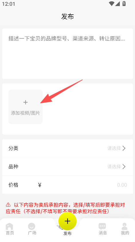 1、打开软件,点击发布,填写龟的品牌型号、添加图片,选择分类品种等信息。