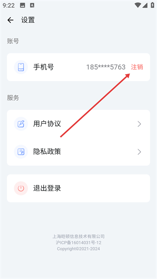 3、在设置页面点击手机号右侧的【注销】选项,进入注销账号页面。