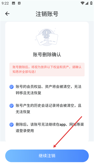 4、在注销账号页面确认勾选相关权益说明后,点击【继续注销】按钮,完成账号注销操作。