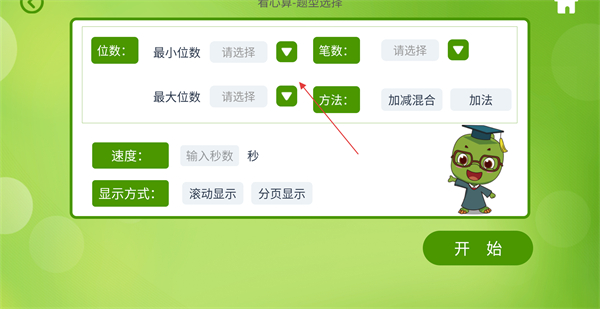 3、在看心算设置页,选择位数、笔数、方法等参数后,点击【开始】启动练习。