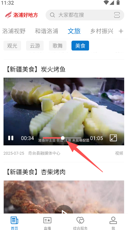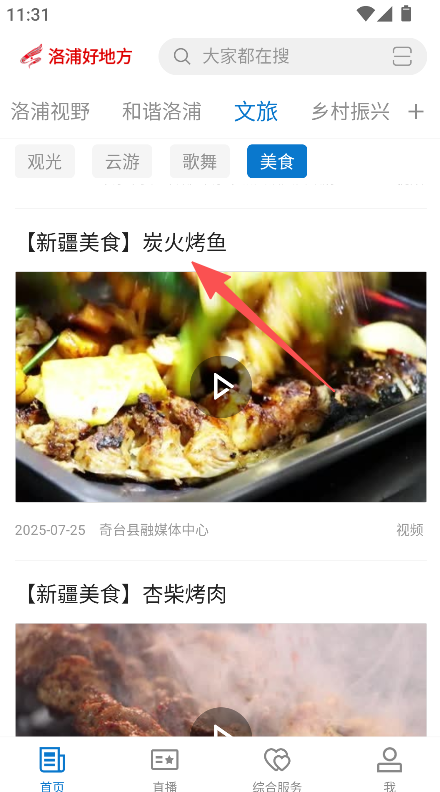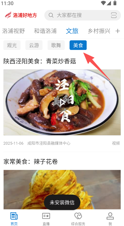 1、进入文旅 - 美食分类,浏览各地美食资讯(如陕西泾阳美食、新疆美食)。