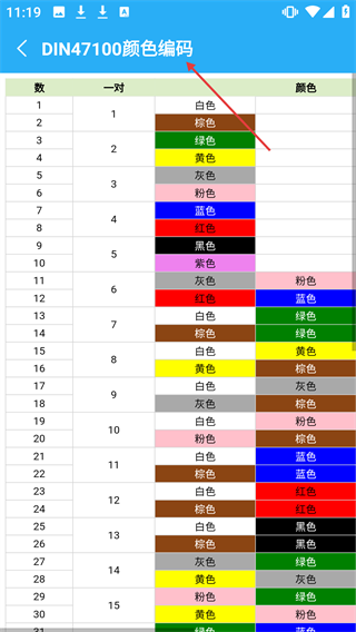 4、可通过该表快速查询【DIN47100颜色编码】中数、一对与颜色的对应关系,便于相关颜色编码的识别与应用。